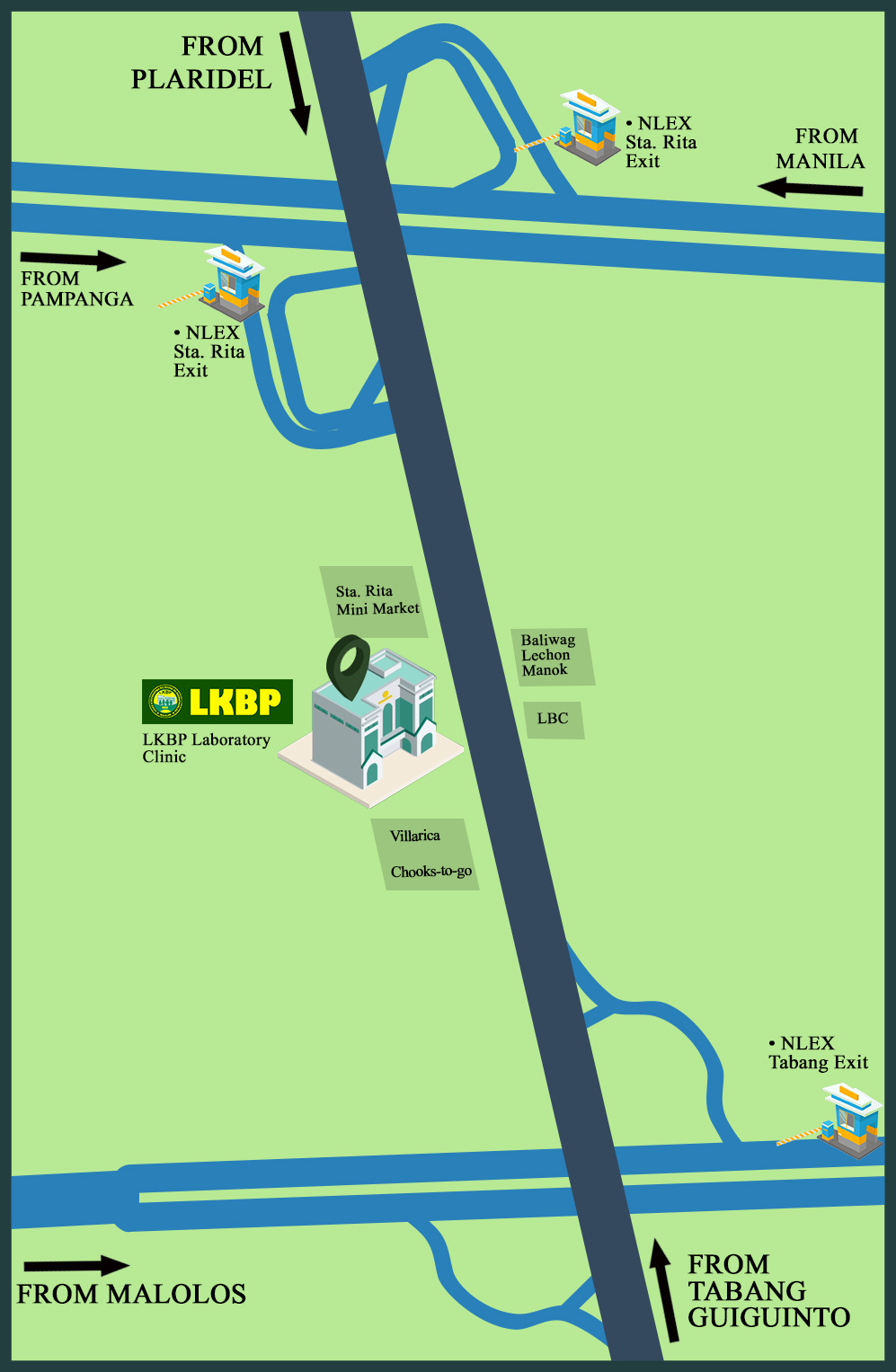 From NLEX Sta. Rita Toll Exit going to Brgy. Tabang, Guiguinto, Bulacan via Sta. Rita National Road. 5-minute ride. Landmark: Sta. Rita, Mini Market (right side), then Seven Eleven Convenience Store and Baliwag Lechon Manok (left side) and then, (right side) LKBP Tower and Business Center.