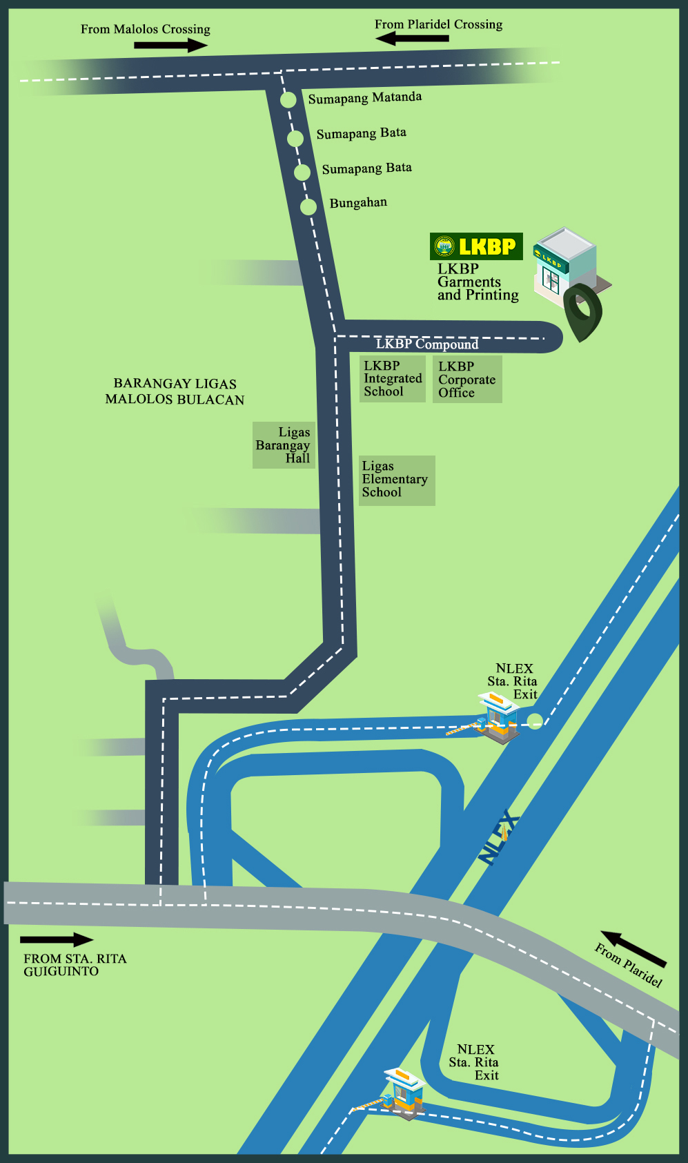 From Bulacan Provincial Capitol going to NLEX Sta. Rita Exit Toll via Sumapa-Bungahan Road 15-minute ride. Landmark: Front of Ligas Catholic Chapel (Left side ), then turn left to LKBP Compound.