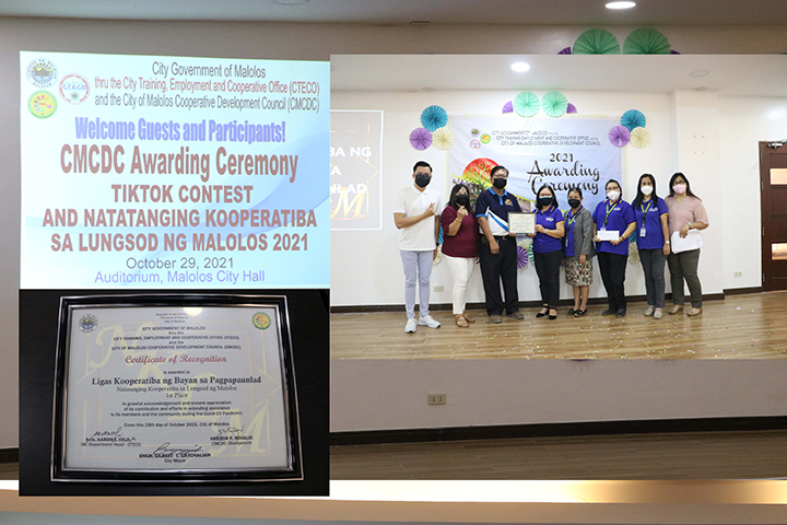 LKBP won first place from the recently concluded Awarding Ceremony of the City of Malolos Cooperative Development Council (CMCDC) for the Natatanging Kooperatiba sa Lungsod ng Malolos (NKLM) held last October 29, 2021 at the Malolos City Hall Auditorium. The CMCDC Awarding Ceremony for Tiktok Contest and Natatanging Kooperatiba sa Lungsod ng Malolos was also participated by other primary cooperatives in Malolos, Bulacan. CMCDC recognizes Cooperatives in Malolos who continue assisting their members and the community during the pandemic. LKBP CEO, Ms. Julita Nazar and the LKBP BOD Chairperson, Ms. Lucila Punongbayan, and Vice-Chairperson, Ms. Loida Hilario received the Certificate of Recognition.